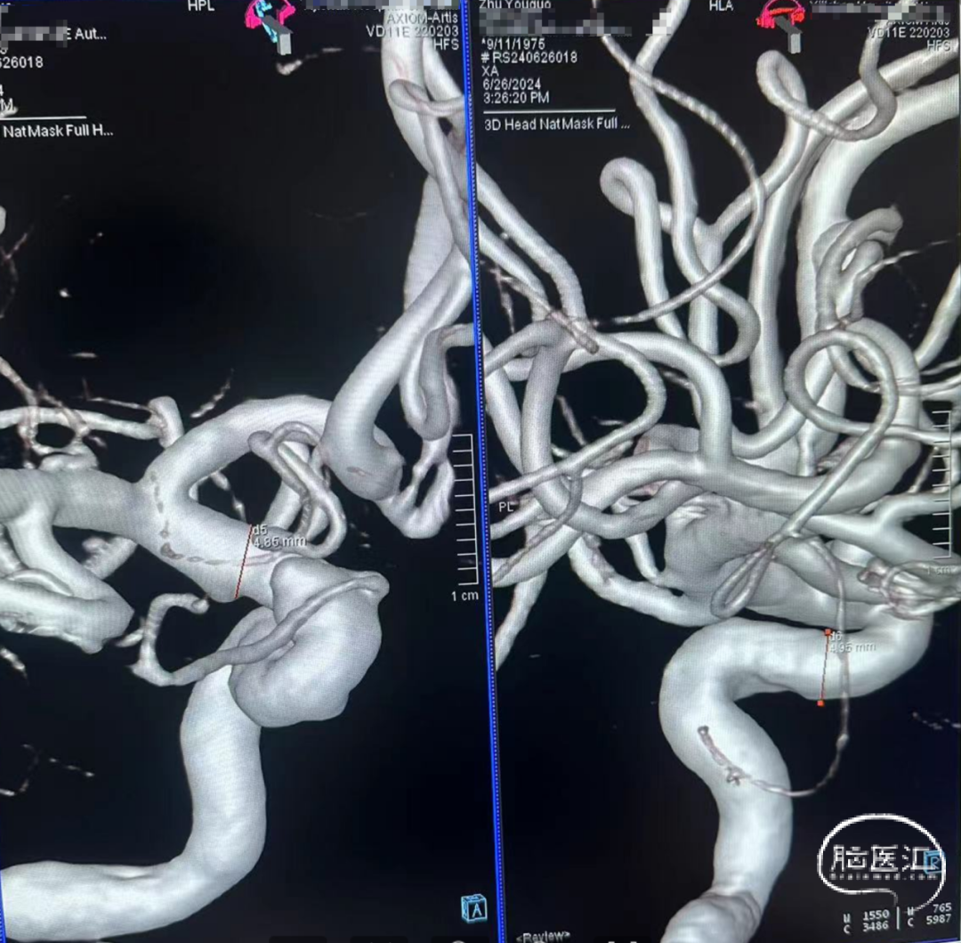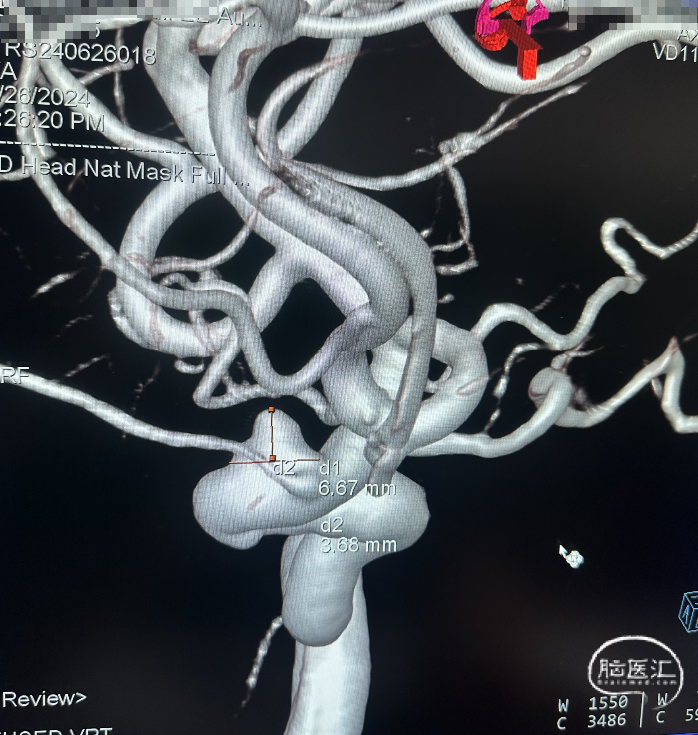 右侧颈内动脉眼动脉段动脉瘤,动脉瘤锥型宽基底,瘤宽6.67mm,瘤高3.68mm,动脉瘤血管远端直径4.86mm,近端直径4.95mm,拟采用密网型号5.0mm*25mm。