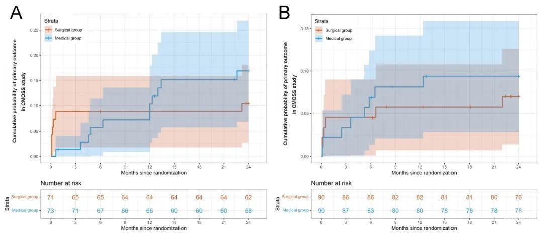 图2. Kaplan-Meier曲线显示CMOSS研究中接受搭桥治疗和单纯药物治疗的患者发生主要结局的概率。将患者以TIA作为入组事件(A, P=0.86,log-rank)和以卒中作为入组事件(B, P=0.55,log-rank)分别进行分析。阴影表示95%可信区间。