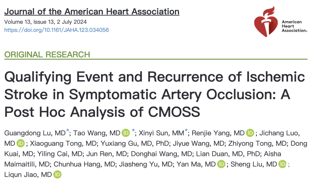 近期,首都医科大学宣武医院神经外科焦力群教授团队在《Journal of the American Heart Association》(JCR分区Q1,IF:5.0)期刊上发表了题为“Qualifying Event and Recurrence of Ischemic Stroke in Symptomatic Artery Occlusion: A Post Hoc Analysis of CMOSS”的研究论文,该文章由宣武医院神经外科卢光东博士后、王韬医生、孙心仪硕士为共同第一作者,首都医科大学宣武医院神经外科焦力群教授为文章通讯作者。