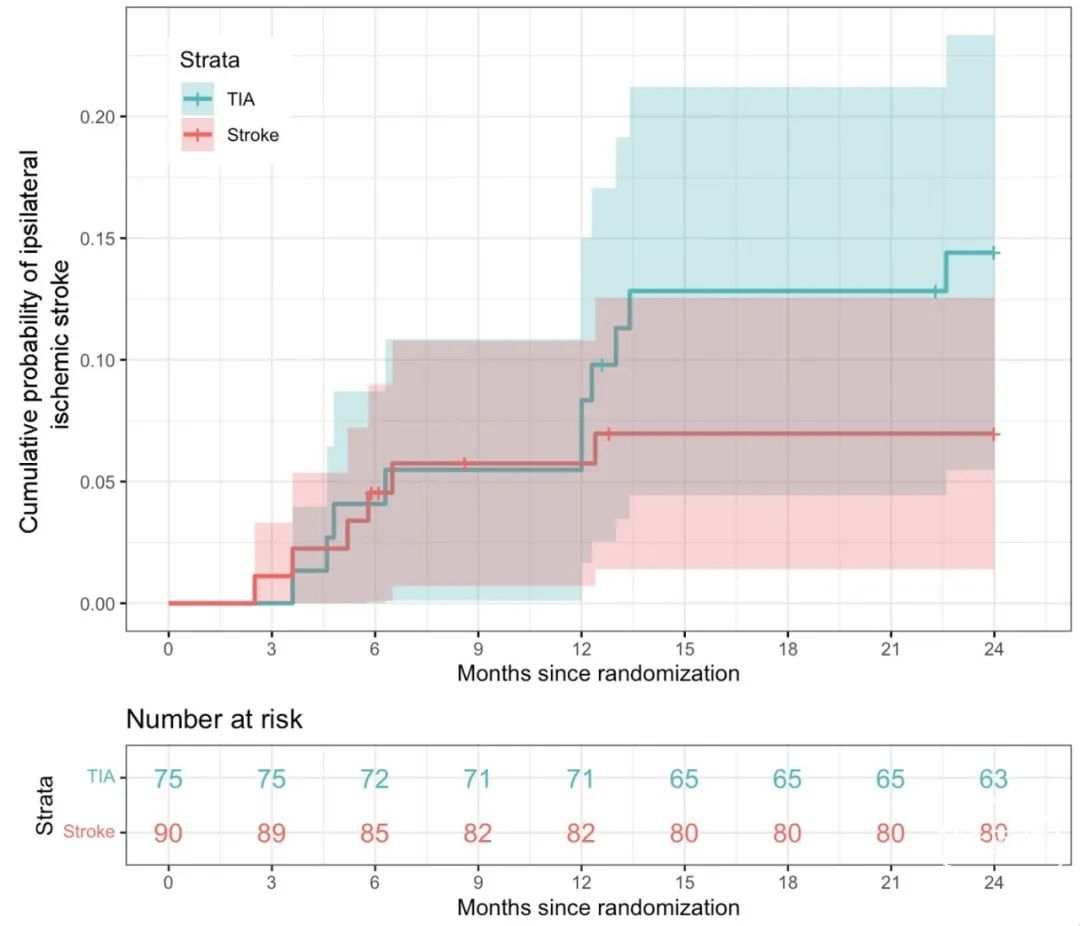 图1. CMOSS研究中仅接受药物治疗的患者发生同侧缺血性卒中的累积概率,根据入组事件进行分层。两组间log-rank检验的P值为0.17。阴影表示95%可信区间。