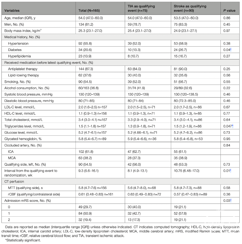 SAMMPRIS试验的事后分析显示,对于颅内动脉狭窄的患者,与短暂性脑缺血发作(TIA)相比,以卒中事件起病的患者随访期间卒中复发的风险显著增加(7% vs 18%)。因此,在美国,颅内支架仅批准用于发生卒中的颅内动脉狭窄患者。然而对于症状性颈动脉或大脑中动脉闭塞患者,入院缺血事件类型和卒中复发的关系尚不清楚。