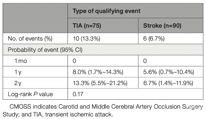 表2. CMOSS研究中仅接受药物治疗的伴不同入组事件的患者在不同时间点同侧缺血性卒中的发生率