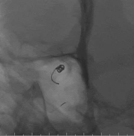 Tethys®中间导引导管和Presgo®微导丝、微导管到位后,先行动脉瘤前下方瘤囊栓塞,陆续填入两枚Jasper®SS弹簧圈,最后行瘤颈填塞,以Jasper®SS弹簧圈收尾,完成瘤腔及瘤颈致密填塞。