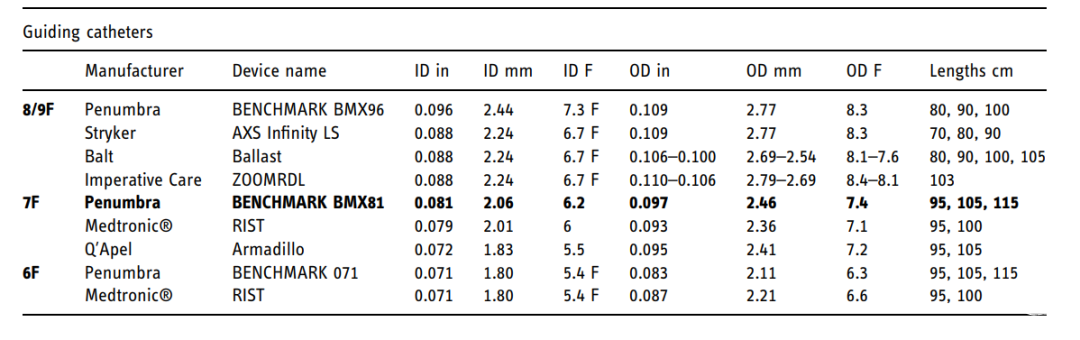 这篇病例报告强调了使用7Fr导管BMX81进行桡动脉入路(TRA),可以实现安全简单的动脉导航,并为神经介入提供满意的支撑。还有几种可用于桡动脉入路的替代导管(表2)。使用8或9Fr导管的优势在于,它可以支持更大内径(0.068-0.072英寸)的抽吸导管。此外,这些导管有时甚至可用于治疗大负荷量血栓。