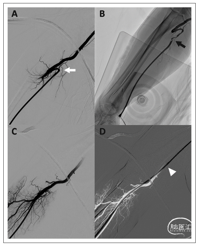图3:右侧桡动脉血管造影显示,尝试通过桡动脉环(A,白色箭头)和随后的血管痉挛(B,黑色箭头)。行右侧尺动脉造影(C)BMX81导引导管成功推送至肱动脉(D,箭头)。