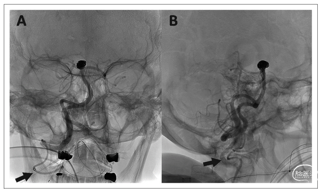 图4:右侧椎动脉AP位(A)和侧位(B)血管造影显示BMX81导引导管导航到右侧椎动脉V3段(黑色箭头),为基底动脉尖动脉瘤栓塞提供支撑。