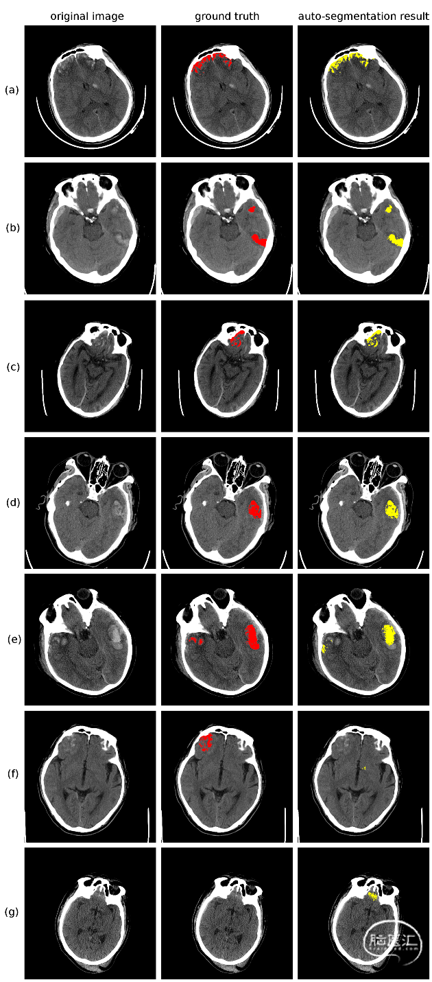 经过训练,Attention-3DUNet神经网络在测试集上实现了0.82±0.30的Dice值,综合表现由于其他3D-UNet和VNet神经网络模型。其能够对大部分脑挫裂伤性出血区域进行分割,然而由于脑挫裂伤出血的高度不规则性和弥散性,部分血肿区域分割不准确,还需要医师进行人为核对。