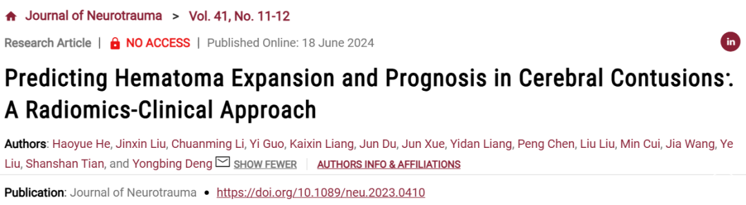 世界著名神经创伤杂志《Journal of Neurotrauma》最近发表了一篇应用影像组学方法预测脑挫裂伤患者血肿扩张风险及其预后的研究成果:《Predicting Hematoma Expansion and Prognosis in Cerebral Contusions: A Radiomics-Clinical Approach》。该研究由重庆市急救医疗中心(重庆市第四人民医院、重庆大学附属中心医院)神经外科邓永兵主任团队完成,结果表明影像组学特征可以作为传统临床特征相关预测的良好补充。