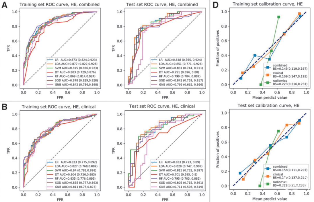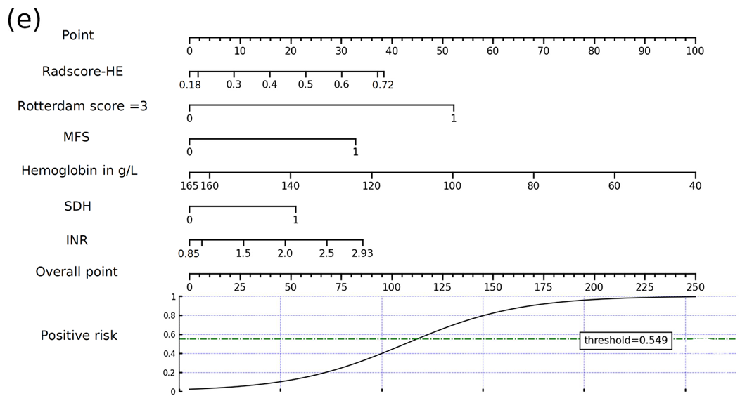 对于HPC,综合血红蛋白水平、Rotterdam CT评分3、多发性血肿模糊征(MFS)、并发硬膜下出血、国际标准化比率和血肿扩大影像组学评分的综合模型在训练和测试队列中分别实现了0.873和0.848的AUC值,优于临床模型的0.833和0.803。联合模型在三家医院的外部验证上也取得了0.836的平均AUC值,显著优于临床模型0.773的AUC值。可见影像组学特征的引入有效改善了联合模型的预测效果。