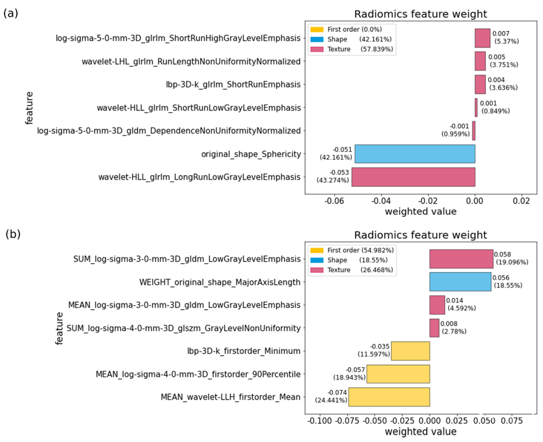 对于HPC,本研究中形状特征Original_shape_Sphericity在影像组学评分中贡献了42.161%的重要性,表明脑挫裂伤病灶球形度越低,其扩大的风险越高;LongRunLowGrayLevelEmphasis和ShortRunLowGrayLevelEmphasis等6个影像组学特征则强调了血肿异质性与HPC之间的影响。