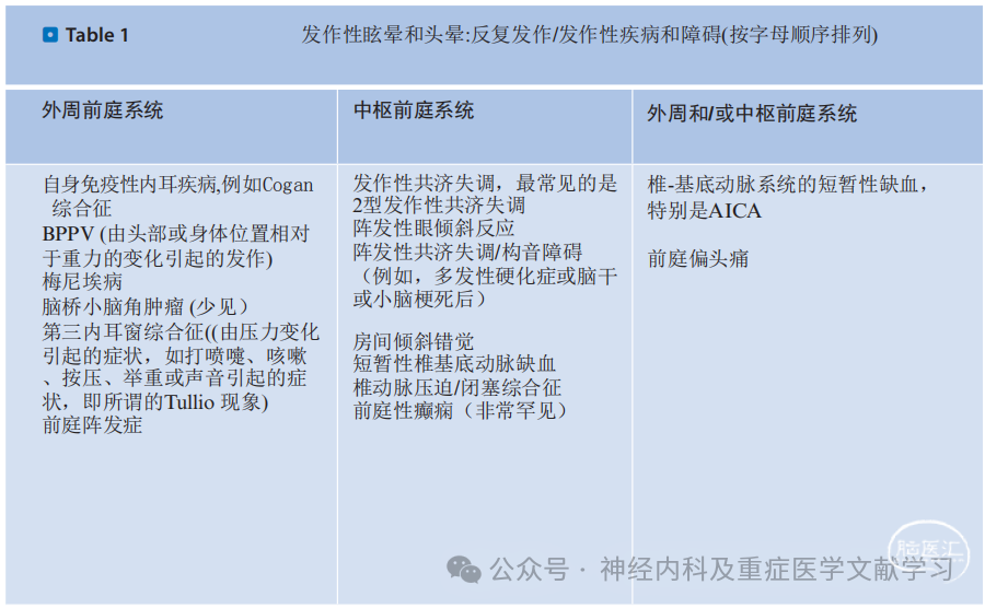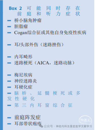 1.听力症状(框2):例如,耳聋或耳鸣,这是梅尼埃病的典型症状,但也可能发生在脑干缺血,特别是AICA梗死/TIA患者中。自声过强,即患者听到自己身体异常大声的声音,通常见于第三内耳窗综合征(最常见的形式:上半规管裂综合征)。