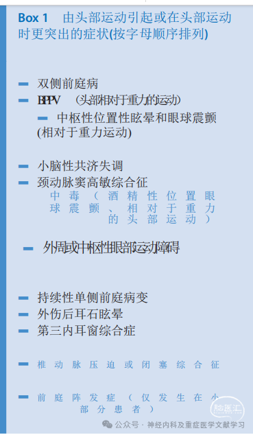 头痛、对光或声音敏感、视觉先兆和/或已知偏头痛:这些症状通常见于前庭偏头痛。然而,头痛也可发生在脑干或小脑梗死或出血患者中(常见病因见框4)。