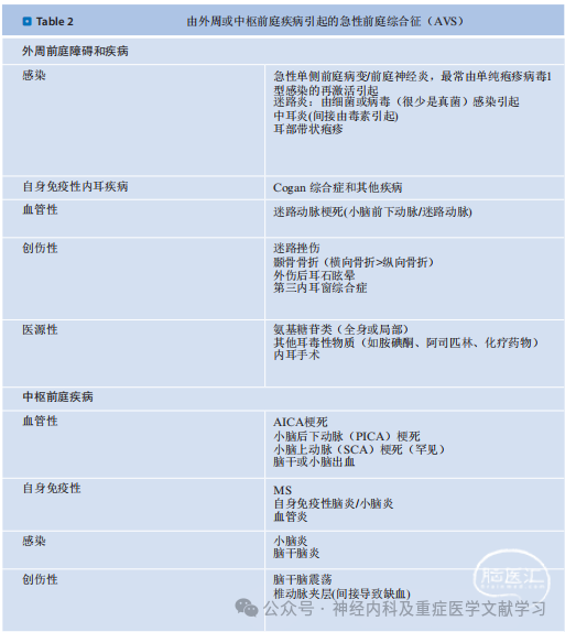 症状或体征是由单侧外周或中枢前庭病变引起的(表2),例如,由于急性单侧前庭病变/前庭神经炎、迷路挫伤,以及在中枢性病变中由于脑干或小脑梗死所致。病理生理上,这些症状和体征是由急性前庭张力失衡引起的,这种失衡在几天到几周内得到补偿。