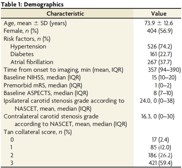 研究共纳入709名患者,平均年龄73.9±12.6岁,基线资料见表1。其中118例(16.6%)为同侧CAD,42例(5.9%)为对侧CAD。同侧和对侧CAD患者中良好的血管代偿(Tan评分=3)分别为56.5%和69.1%(图2)。