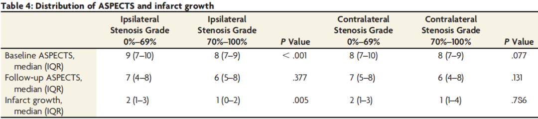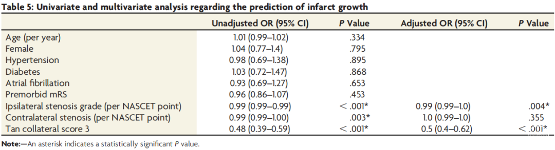与非CAD组(中位数:2;IQR:1-3)相比,同侧CAD组的梗死增长较少(中位数:1;IQR:0-2)(P=0.005),且CAD组的基线ASPECTS更低(P<0.001)。但是,CAD患者和非CAD患者梗死面积后期随访时总体上相似(P=0.337)。对侧CAD与梗死灶的大小或增长无关(表4)。多变量分析显示,同侧颈动脉狭窄增加程度(调整后OR:1.0;95%CI:0.99-1.0;P=0.004)和良好的侧支循环(调整后OR:0.5;95%CI:0.4-0.62,P=0.001)与较少的梗死增长相关(表5)。