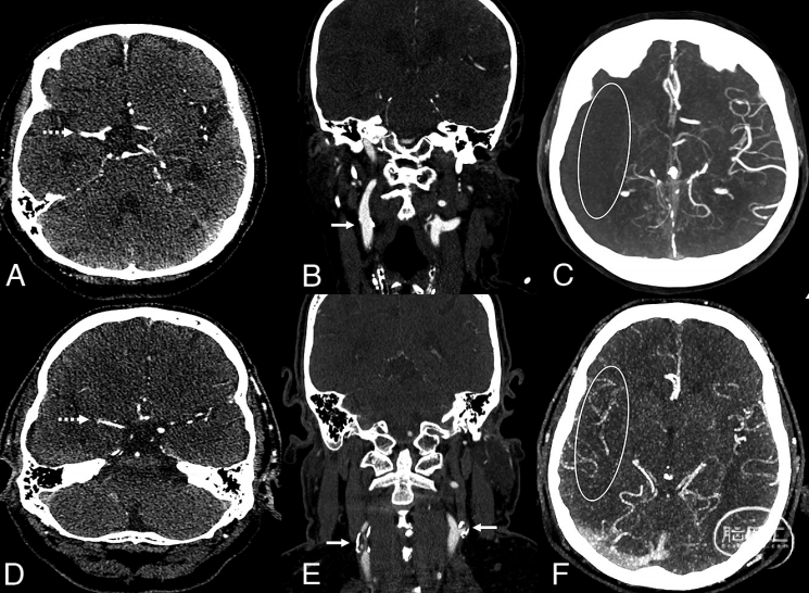 图1. 急性右侧大脑中动脉M1段闭塞侧支循环优劣2例(A、D,虚线箭头)。例1无同侧或对侧颈内动脉颅外段狭窄(B,直箭头),颅内侧支循环差,Tan评分0(C)。例2显示同侧和对侧颈动脉病变(E,直箭头),颅内侧支循环好,Tan评分3(F)。