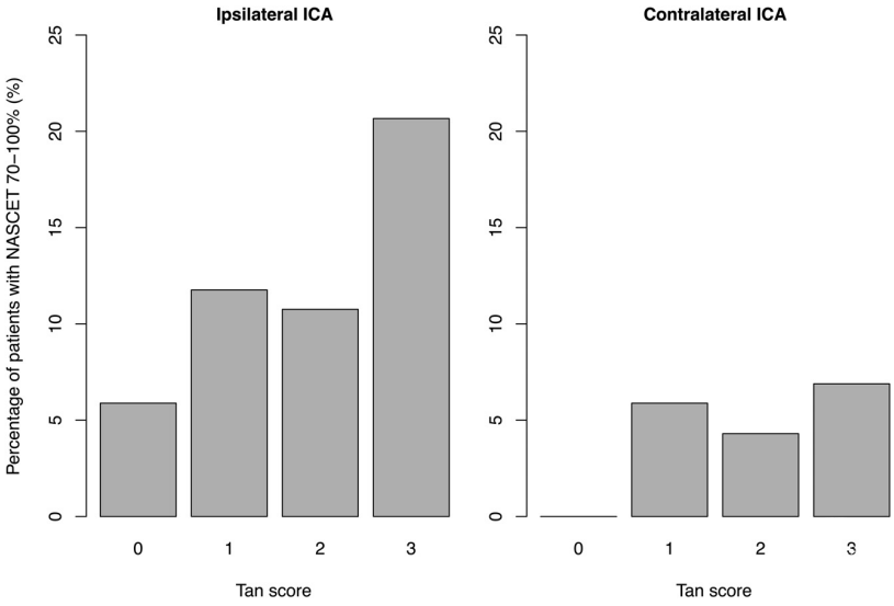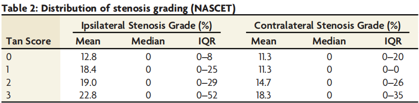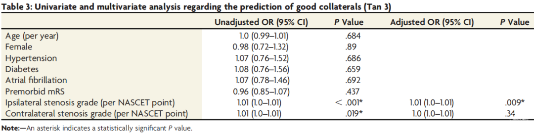 颈动脉狭窄程度与侧支循环:平均Tan评分随狭窄程度的加重而略有增加(表2)。Tan评分与同侧(rho=0.11)或对侧CAD(rho=0.09)之间没有等级相关性。然而,在多变量分析中,同侧狭窄程度是良好侧支循环的独立预测因子(调整后的OR:1.01/NASCET点;95%CI:1.0–1.01;P=0.009),而对侧狭窄程度则不是(P=0.34)(表3)。