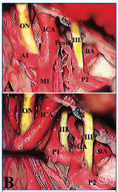 后交通动脉(PComA)源自颈内动脉的后内侧表面,向后内侧和向上穿行,与大脑后动脉(PCA)相连[17]。对于外科医生,在脚间窝进行手术时,使用经典翼点入路或其眶颧或颞前扩展时,PComA可能会阻碍视野并降低可操作性。为扩大工作空间,Yasargil提出在7例基底动脉尖动脉瘤患者的手术中切断发育不全的PComA[26,28]。随后也有其他报道[7,23,29]。然而,这种技术并不常见,因为外科医生害怕阻断PComA穿支血流或PCA,并且担心缺血风险[16,22,29]。切断PComA的大多数已发表报道仅为个案报道,且这个主题从未在更大规模的系列研究中报道和详细讨论[16,22]。在一项回顾性研究中,我们分析血管性或肿瘤性脚间窝区域病变切断PComA的患者资料,讨论这一重要外科手术步骤的安全性和详细技术。