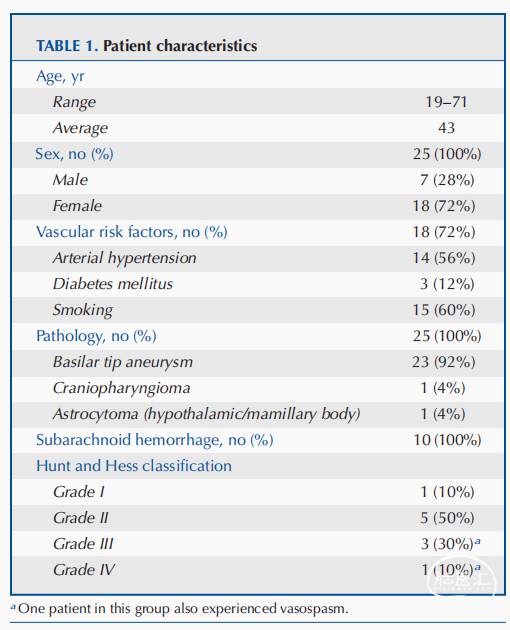 一共25名患者,其中23名患者(92%)为血管性病变,2名患者(8%)为肿瘤性病变。所有患者均采用颞前经海绵窦入路。男女比例为7:18。患者年龄在19至71岁之间(平均43岁)。18名患者(72%)具备一个或多个血管性风险因素。所有血管性病变组患者均因远端基底尖动脉瘤而接受手术。在肿瘤性病变组中,一名患者患有视交叉后颅咽管瘤,另一名患者患有来自乳头体区的乳头状星形胶质瘤。在23名基底尖动脉瘤患者中,有10名患者(44%)出现蛛网膜下腔出血。其中2人患有术后血管痉挛。患者详细特征见表1。