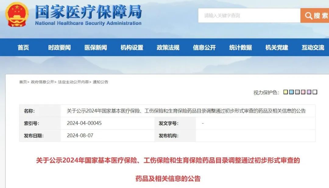 8月7日晚,国家医保局公开了今年通过医保目录初审的药品名单。这一文件的全称是《2024年国家基本医疗保险、工伤保险和生育保险药品目录调整通过初步形式审查的申报药品名单》。