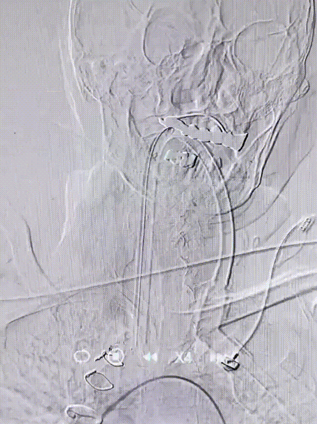 股动脉穿刺,置入8F动脉鞘。5F猪尾巴造影管行主动脉弓上造影,退出5F猪尾巴造影管后利用泥鳅导丝置入5F单弯造影管分别置于双侧颈总动脉行选择性造影显示:右侧大脑中动脉M1段闭塞,余脑血管未见明显异常。