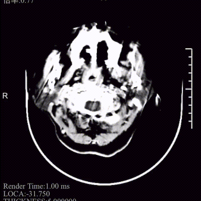 体温:36.6℃,脉搏:84次/分,呼吸:18次/分,血压:158/77mHg。神清,精神差,构音障碍,双眼向右侧凝视,左侧鼻唇沟变浅,示齿口角右偏,咽反射存在,伸舌稍左偏,左上肢肌力1级,左下肢下肢1级,左侧痛觉减退,左侧巴氏征(+)。NIHSS评分15分(意识水平提问1分,构音障碍2分,部分凝视1分,面瘫2分,左上肢4分,左下肢4分,浅感觉1分),洼田饮水试验未评,mRS评分4分。