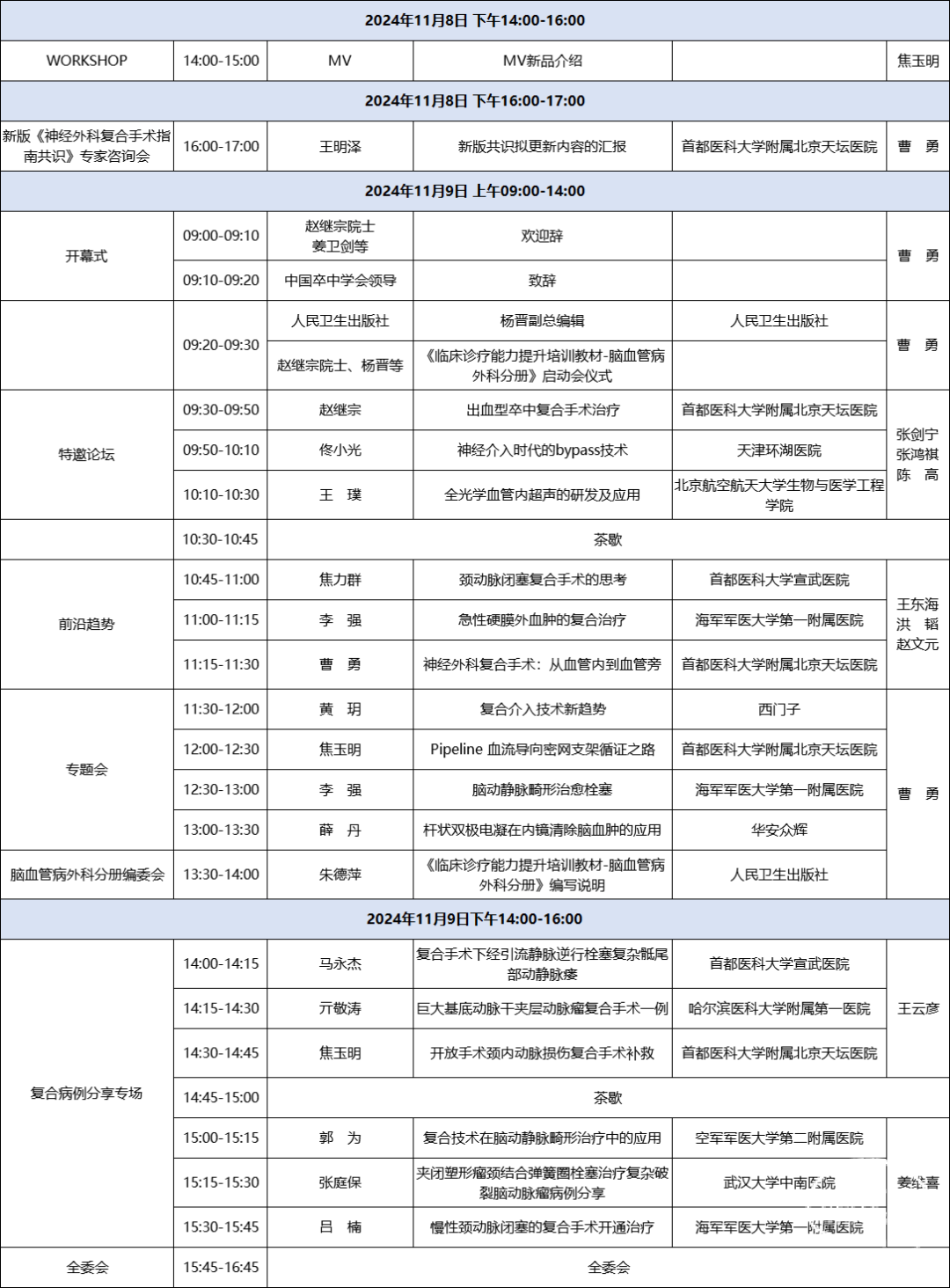 同时,大会将召开人民卫生出版社联合国家神经疾病医学中心《临床诊疗能力提升培训教材-脑血管病外科分册》编写启动会和新版《神经外科复合手术指南共识》专家咨询会。