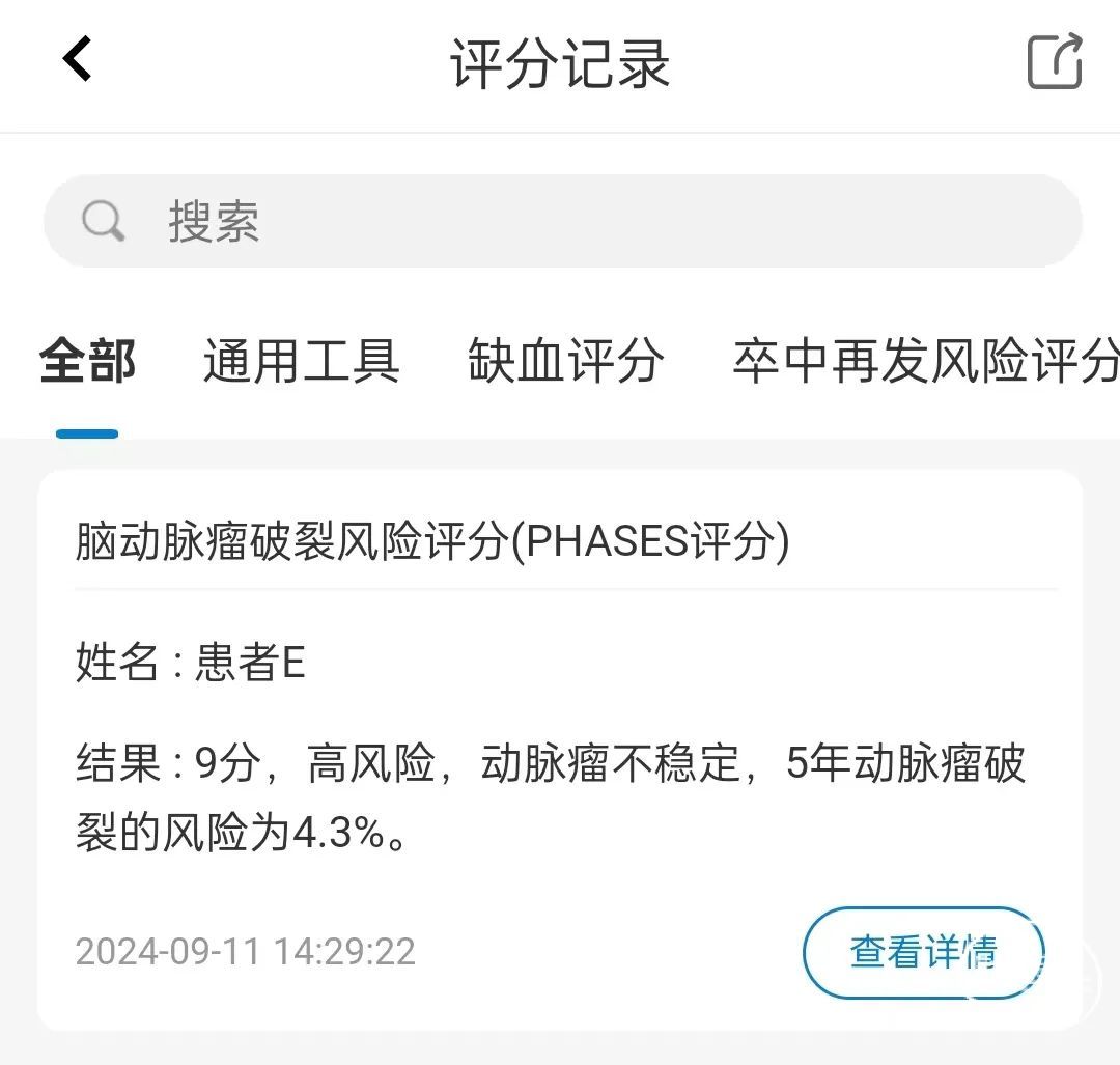 在脑血管手术前,医生需要对患者脑动脉瘤的破裂风险进行评估,以确定手术的紧迫性和方法。PHASES评分是一种用于评估未破裂脑动脉瘤破裂风险的评分工具,它结合了多种临床和影像学因素,为医生提供了一个量化的风险评估。
