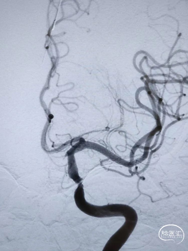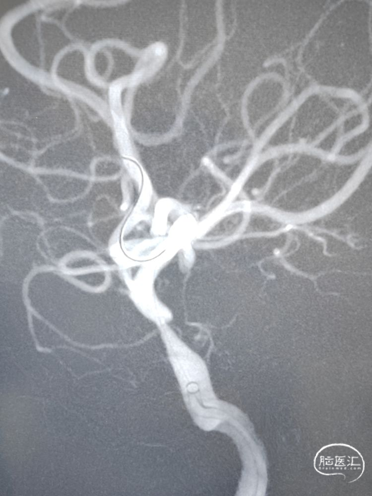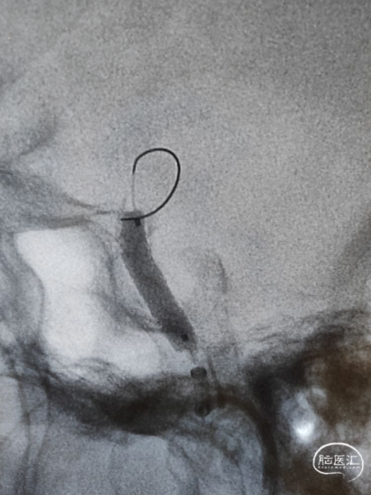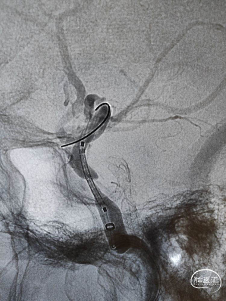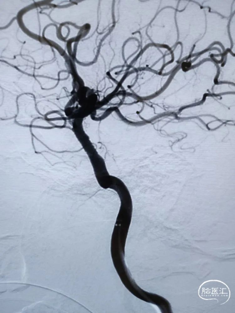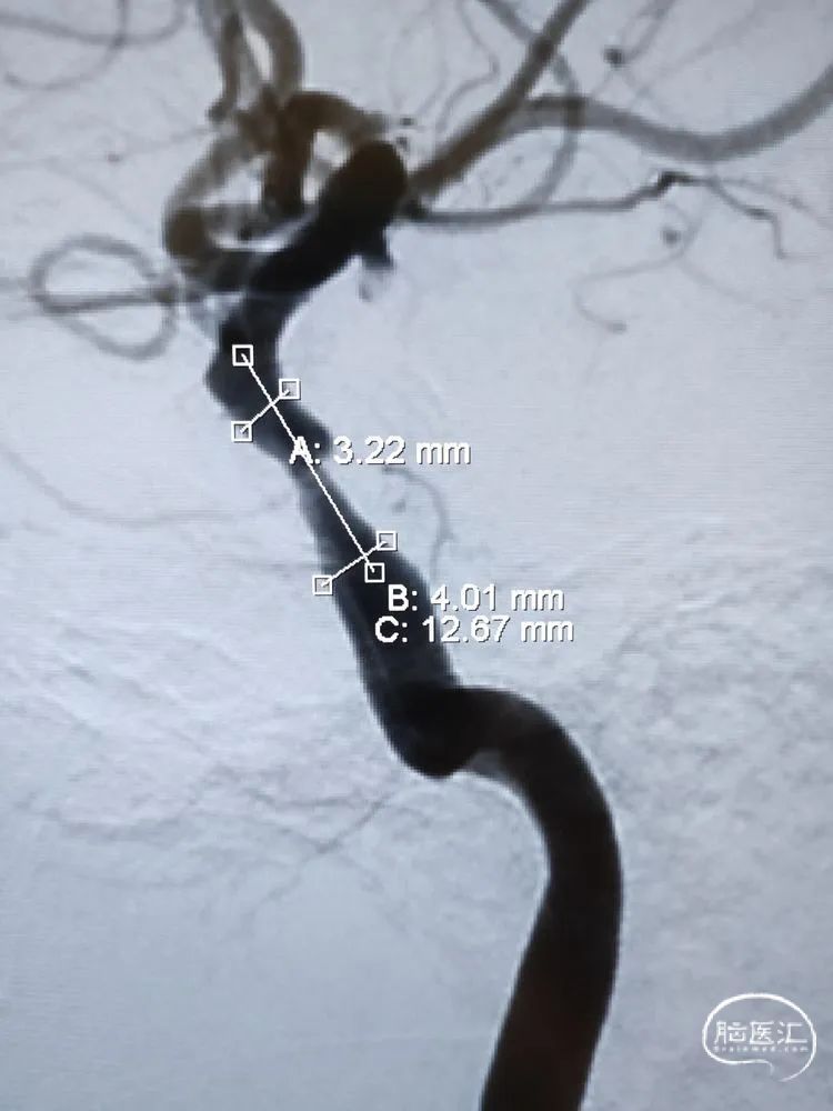 DSA检查:远端正常段管径约3.22mm,近端接近正常段管径约4.01mm,预估支架长度约12.67mm;合并后交通动脉圆锥。