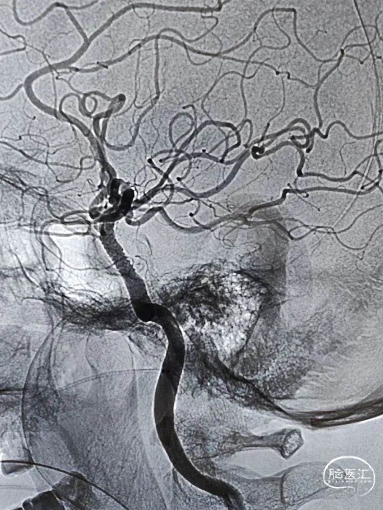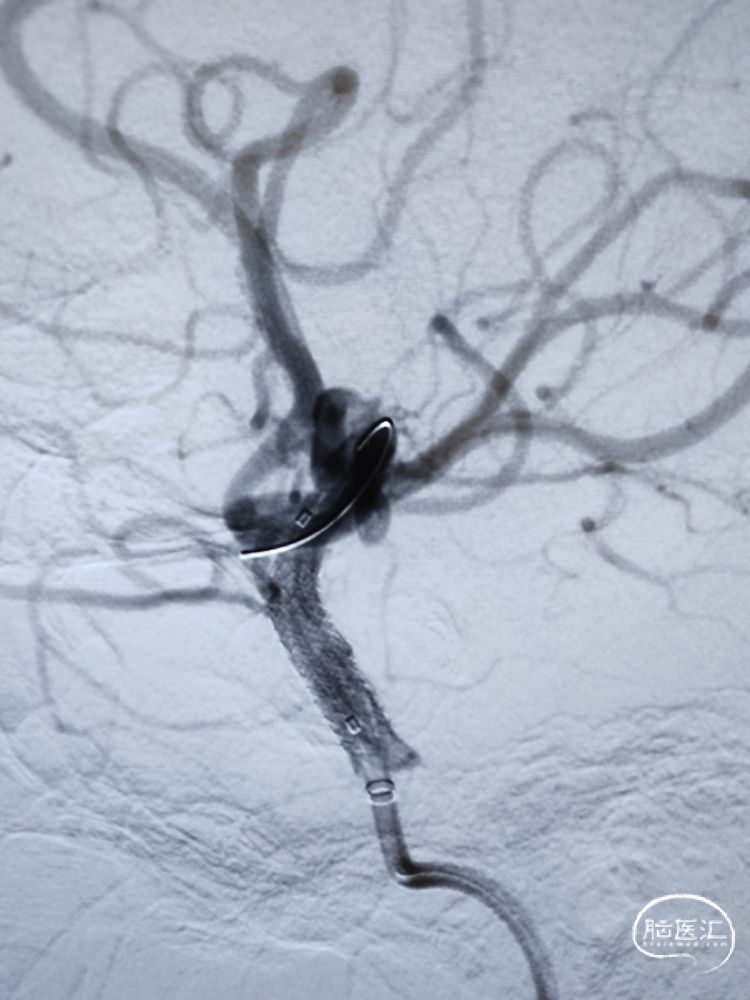 留置微导丝,撤出支架释放系统,观察10分钟后造影提示血流无异常,遂撤出微导丝。侧位、正位造影减影像和非减影像提示颈内动脉海绵窦段支架内和远端血流通畅,支架顺应血管贴壁良好;由于近端血流改善,后交通动脉充分显影。