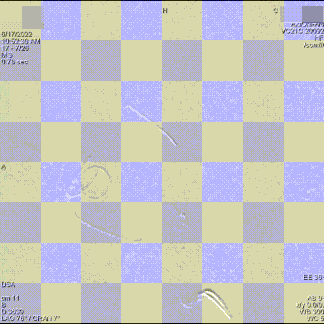 2、本例术中应用100%可回收的YonFlow®血流导向密网支架,支架网丝远端头端具有“球头设计”,输送顺滑,可避免管壁损伤,多次回收再释放,帮助术者实现精准定位;其钴铬合金材质网丝可以提供适宜的径向支撑力,又有较好的顺应贴壁表现;创新设计的可控解脱释放方式,可解决目前传统血流导向密网支架临床应用中面临的许多困难,在支架定位、打开贴壁、精准落点、安全性方面带来很大的提升。