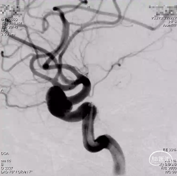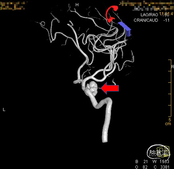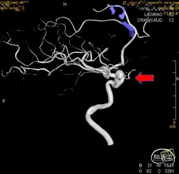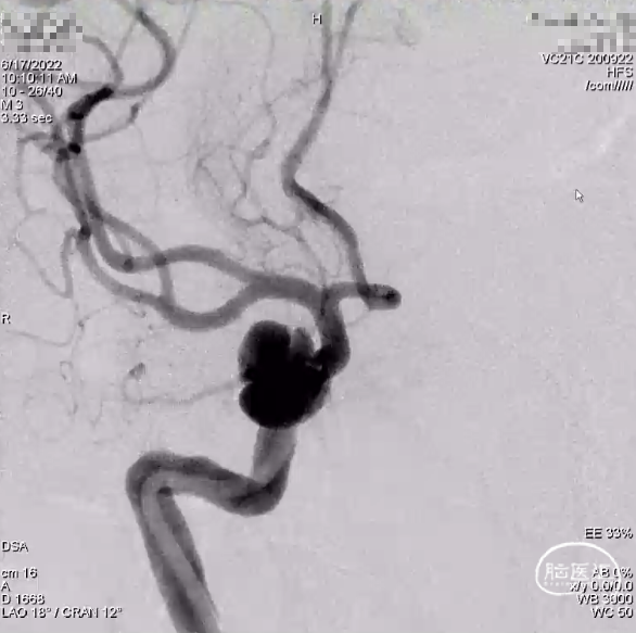 入院诊断:1、右侧颈内动脉眼动脉段-海绵窦段串联动脉瘤;2、左侧大脑中动脉动脉瘤;3、高血压病2级(高危组)。