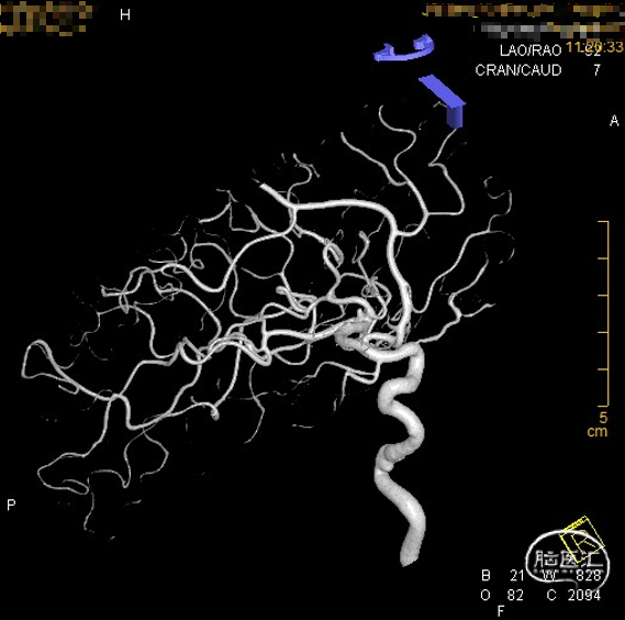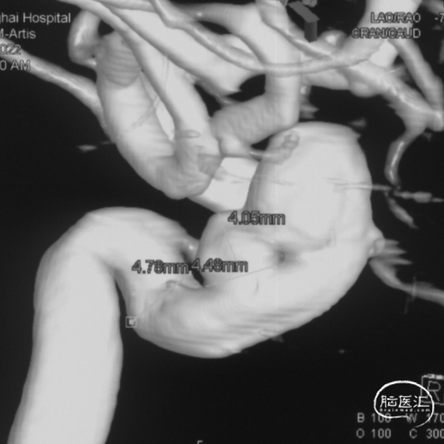 左侧大脑中动脉分叉处微小动脉瘤大小约2.3mm*1.5mm*1.1mm,瘤颈宽1.7mm(不处理)。
