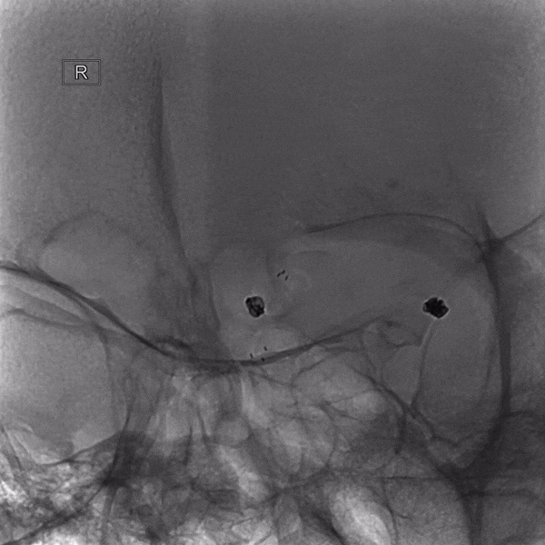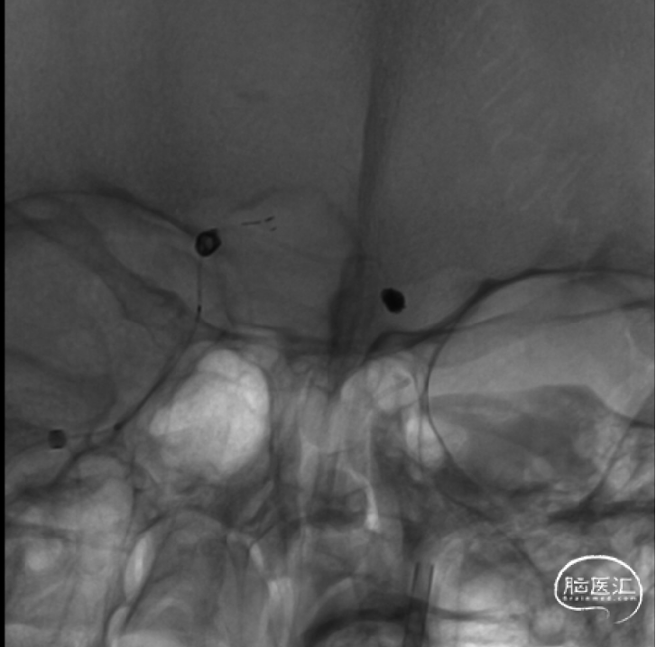 2.右侧颈内动脉颅内支撑导管,栓塞微导管RICA→AComA→An;