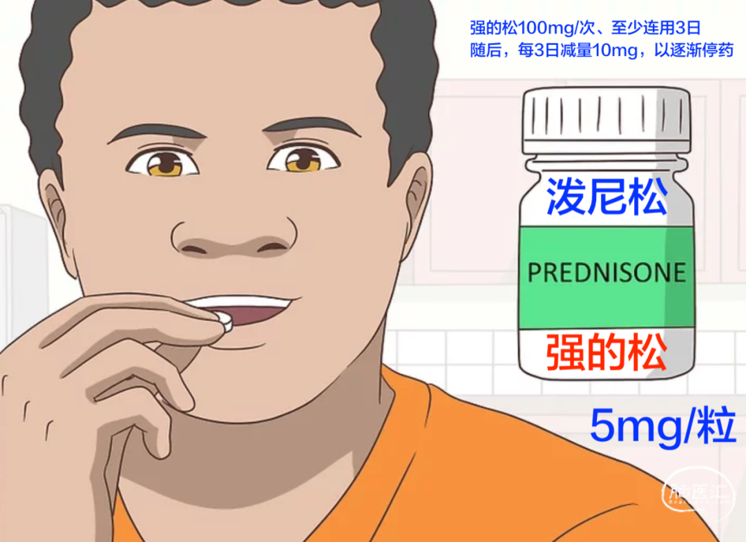 晨起,60~80mg/日的强的松(泼尼松)顿服,连用1周。