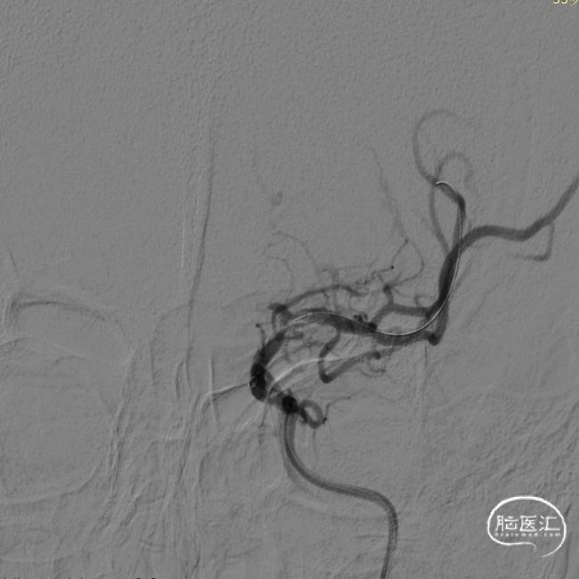 责任血管为左侧颈内动脉C7段,提示重度狭窄(95%),左侧大脑中动脉上干(额支)可见低灌注所致显影不连续。结合患者目前的运动性失语表现,考虑此次脑梗死的分型为大动脉粥样硬化型,动脉-动脉栓塞合并低灌注栓子清除率下降的混合机制。事不宜迟,与患者家属再次沟通病情及下一步的手术建议,拟行右侧颈内动脉C7段球囊扩张成型术备支架置入成型术。老张的老婆还是很爱老张的,很快签字同意了手术方案。