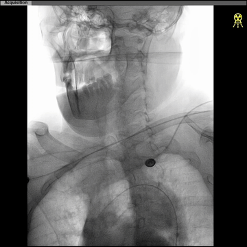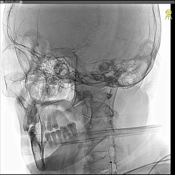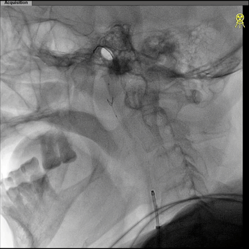 西蒙管于左CCA造影,用硬泥鳅导丝超选入枕动脉,并西蒙管前推上高到枕动脉,加强上支撑,后长鞘顺利过弓,抵达左CCA远端。