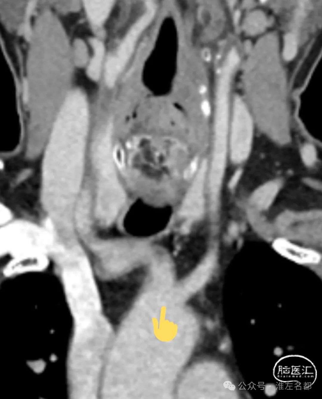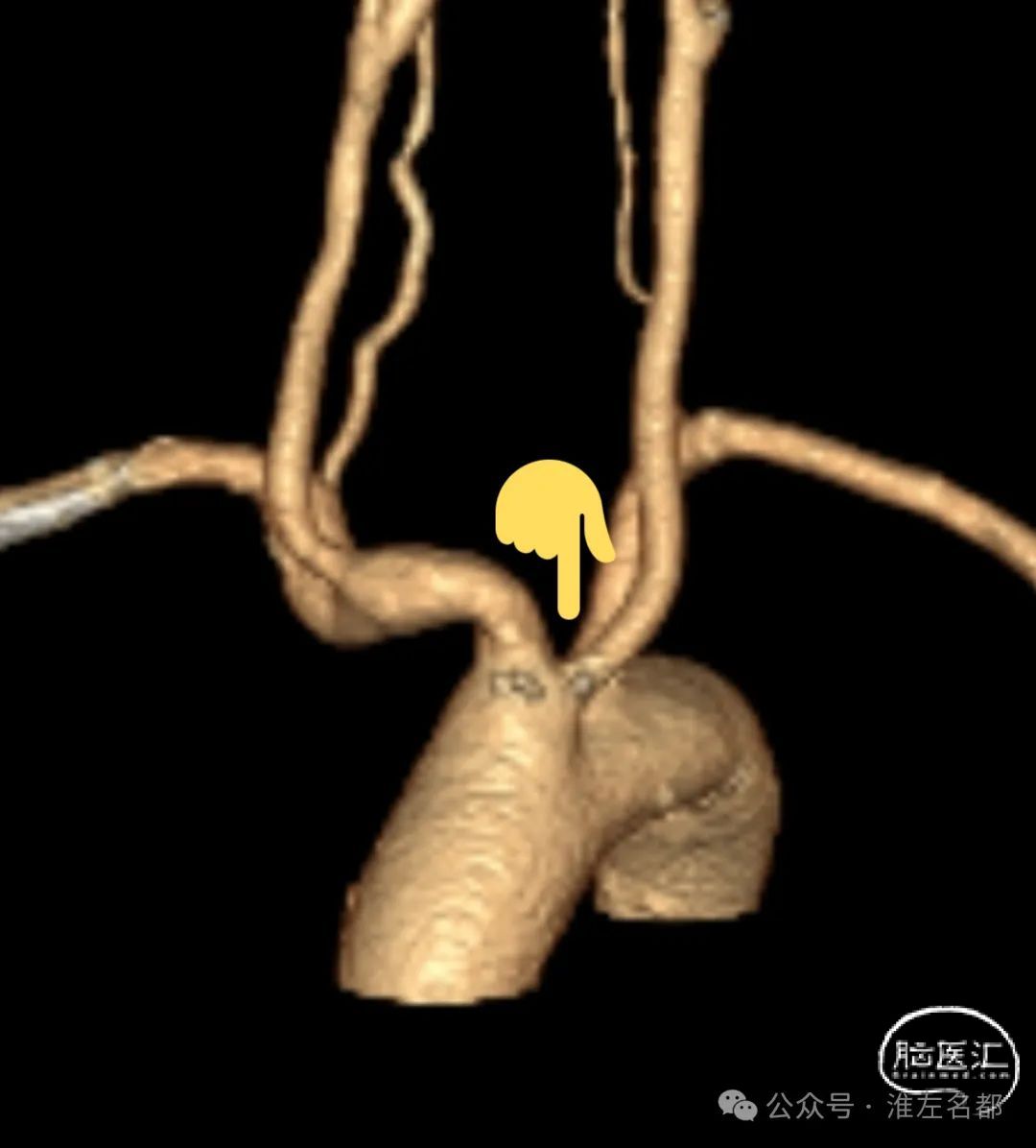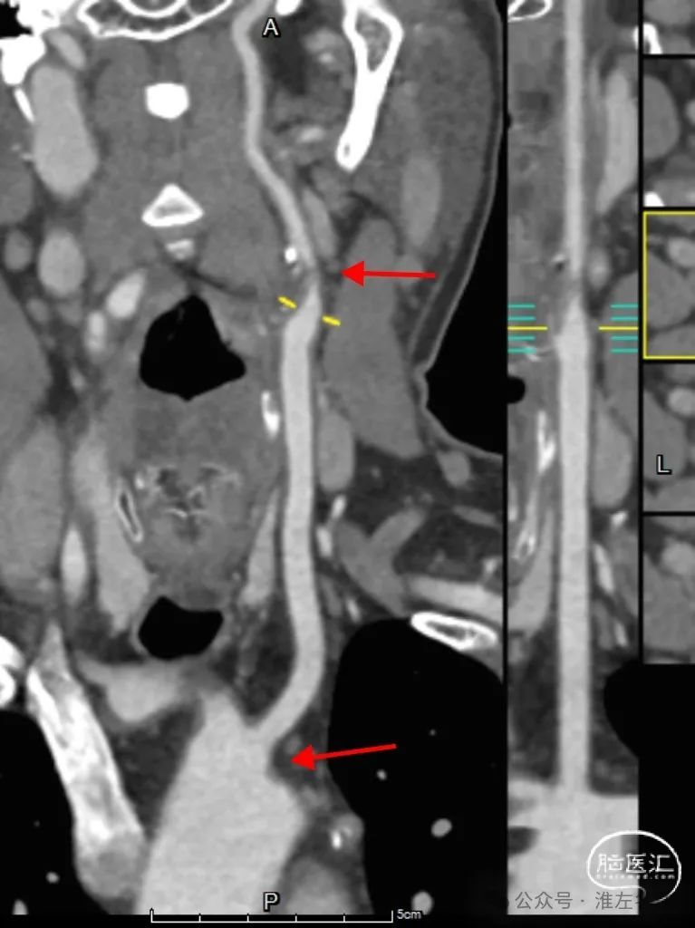 CTA:左ICA起始部重度狭窄,左CCA与无名动脉短共干,左CCA起始段走行明显向左,与主动脉弓呈显著锐角。