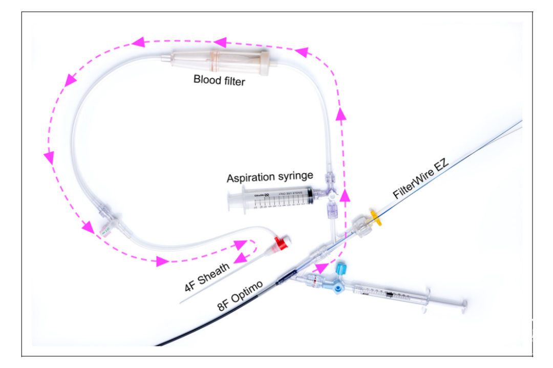 图3:前臂双保护技术中的动静脉分流回路。血液从放置在颈总动脉的8F Optimo流向前臂头静脉的4F鞘,中间有一个血液过滤器。血液可以通过8F Optimo从回路中进行抽吸。
