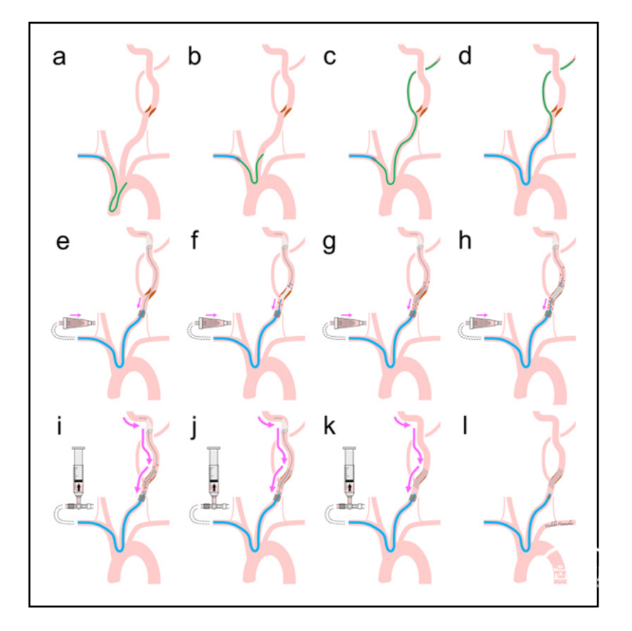 图2:使用前臂双重保护技术进行左侧颈动脉支架置入术的示意图。(a, b)通过右侧经桡无鞘化方法,6F Simmons导管(Shinshu 8; Medikit, Tokyo, Japan)通过8F球囊导引导管(8F Optimo; Tokai Medical Products, Aichi, Japan)推送至左侧颈总动脉(CCA)。(c)6F Simmons导管推送至颈外动脉,并置入一根硬导丝。(d)8F球囊导引导管推送至左侧CCA。(e)在远端颈内动脉颈段放置远端过滤保护装置(FilterWire EZ; Boston Scientific, Marlborough, MA, USA)后,充盈8F球囊导引导管。8F球囊导引导管连接到放置在头静脉中的4F鞘管,并通过一个中间血液过滤器创建动静脉分流回路。(f-h)在双重保护下,进行预扩张、支架置入和术后扩张。(i, j)通过分流回路手动抽吸,直到未观察到可见斑块碎片。注意,颈内动脉中通过抽吸去除碎片在(j)中比(i)中少。(k)在血流逆转下取出远端过滤保护装置后,再次手动抽吸,直到未观察到可见斑块碎片。(l)8F球囊导引导管卸压。
