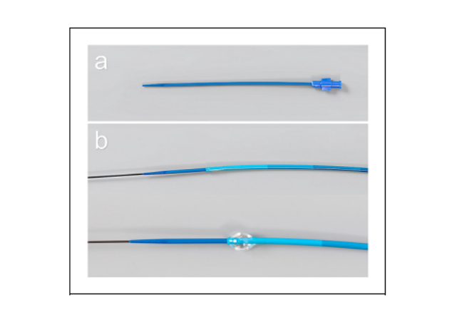 图1:8F球囊导引导管图片(8F Optimo;Tokai医疗产品,爱知,日本)及其配件,专为无鞘化入路。(a)预扩张器。(b)8F球囊导引导管(上面,球囊卸压;下面,球囊充盈)和它的扩张器兼容0.035英寸的导丝。