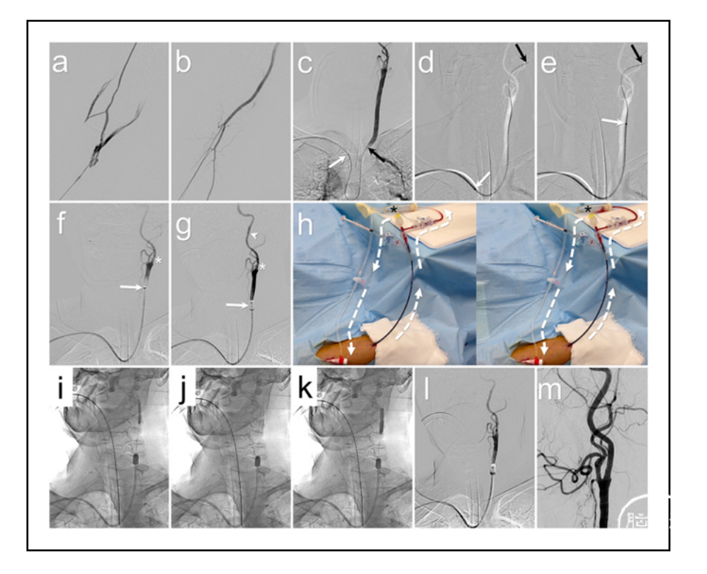 图5:在使用前臂双重保护技术进行左侧颈内动脉(ICA)狭窄的颈动脉支架置入术中的术中造影影像、路图影像、临床影像和透视影像。(a)一根4F鞘管被置入右侧前臂的头静脉。(b)另一根4F鞘管被置入右侧桡动脉。(c)通过经桡无鞘化方法,将8F球囊导引导管(白色箭头)送入右侧锁骨下动脉。6F Simmons导管(黑色箭头)推送至左侧颈动脉(CCA)。(d)6F Simmons导管(黑色箭头)推送至左侧颈外动脉。白色箭头指示8F球囊导引导管。(e)8F球囊导引导管(白色箭头)推进至左侧CCA。黑色箭头指示6F Simmons导管。(f)通过8F球囊导引导管(白色箭头)进行的左侧CCA血管造影显示ICA狭窄(白色星号)。(g)在远端ICA颈部放置远端过滤保护装置(白色短箭头)后,充盈8F球囊导引导管(白色长箭头)。白色星号指示ICA狭窄。(h)8F球囊导引导管连接到放置在头静脉中的4F鞘管,并通过一个中间血液过滤器(黑色星号)形成分流回路。白色虚线箭头反映分流回路中的血流。血液朝头静脉方向流动。(i)进行预扩张,(j)支架置入,(k)术后扩张,分别使用3.5×30mm Sterling球囊(Boston Scientific, Marlborough, MA, USA)、8.0×21mm Wallstent(Boston Scientific)和4.5×30mm Sterling球囊。(l)通过分流回路手动抽吸后,血管造影显示成功再血运重建。(m)最后,血管造影显示成功再血运重建。