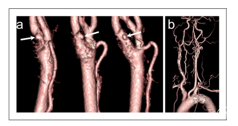 图4:术3DCTA图像。(a)术前左侧颈总动脉3D CTA(左、右前斜位;中间,右侧视图;右,右后斜位)显示左侧颈内动脉起始处狭窄伴溃疡斑块(白色箭头)。(b)患者主动脉弓为III型。