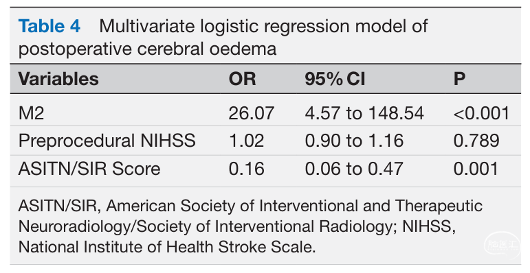 本研究显示术前NIHSS评分、入院舒张压和出血转化与术后90天预后不良独立相关,ASITN/SIR评分低与术后脑水肿独立相关,这与既往研究的结果一致13 39。M5受累是术后90天预后不良的可能预测因素,多项既往研究也得出类似结论11 13,可能的原理如前文所述。