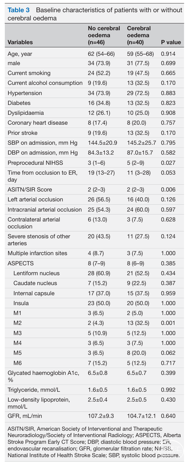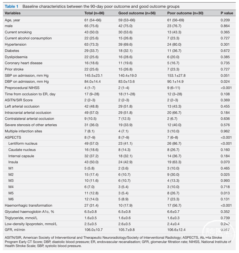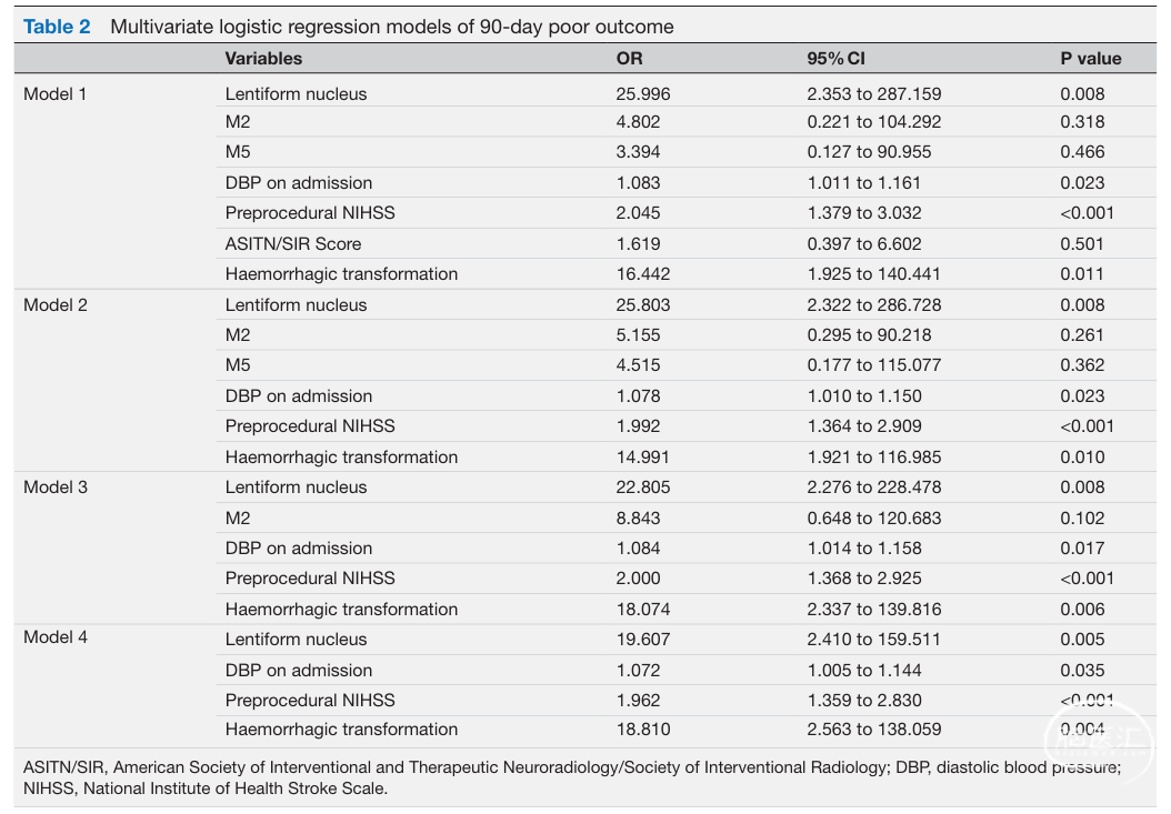 本研究发现,对于接受ER治疗的症状性非急性前循环大动脉闭塞患者,豆状核受累是术后90天预后不良的独立危险因素,M2受累是术后脑水肿的独立危险因素。需要进一步的多中心大样本前瞻性RCT研究,以验证梗死位置对非急性闭塞再通患者临床结局的影响。
