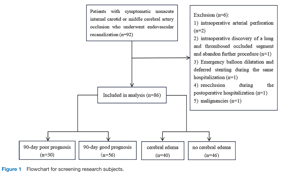 回顾性连续纳入2019年1月~2024年1月在西安交通大学第二附属医院卒中中心接受ER治疗的症状性非急性前循环大动脉闭塞患者。纳入标准为:1)颈内动脉或大脑中动脉闭塞由MRA或CTA发现并经DSA证实;2)病因为动脉粥样硬化;3)发现动脉闭塞与手术治疗之间的时间>24h;4)过去12个月内出现颈内动脉或大脑中动脉闭塞导致的缺血性卒中;5)尽管接受了包括抗血小板治疗、他汀类药物、控制血压和血糖以及强调健康生活方式在内的最佳药物治疗,但仍有与颈内动脉或大脑中动脉闭塞相关的短暂性脑缺血发作(Transient ischemic attack, TIA)或卒中复发;6)接受非急性ER治疗,术后mTICI≥2b。排除标准包括:1)术中动脉穿孔导致ICH;2)术中发现闭塞段长且血栓多而放弃继续手术;3)分期手术,即急诊球扩、同次住院期间延期支架置入;4)术后住院期间再闭塞;5)合并恶性肿瘤。