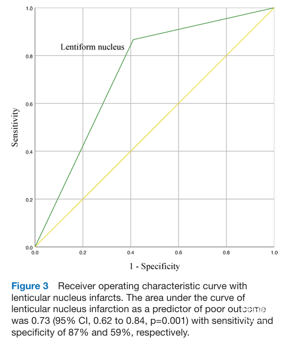 采用逐步退出法构建多个Logistic回归模型(表2),结果显示,在所有模型中,豆状核梗死、入院时舒张压、术前NIHSS评分和出血转化均为90天预后不良的独立预测因素。通过受试者工作特征曲线评估豆状核梗死作为90天预后不良预测因素的价值,发现曲线下面积为0.73(95%CI 0.62~0.84, P=0.001),灵敏度和特异度分别为87%和59%(图3)。