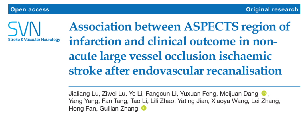 2. Xia J, Gao H, Zhang K, et al. Effects of endovascular recanalization on symptomatic non-acute occlusion of intracranial arteries. Sci Rep 2023;13(1):4550. doi: 10.1038/s41598-023-31313-4 [published Online First: 20230320]