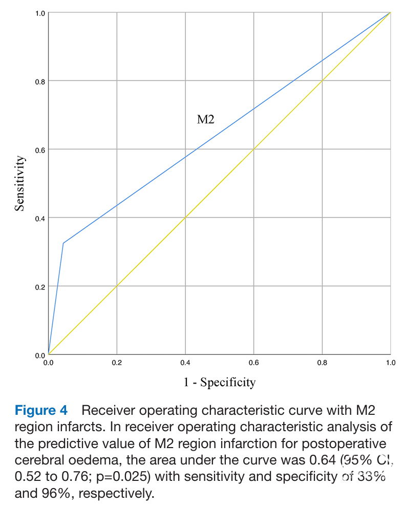 术后脑水肿40例(46.5%)。与无脑水肿患者相比,有脑水肿患者的M2区梗死发生率(32.5% vs. 4.3%)和术前中位NIHSS评分(5 vs. 3)显著较高,ASITN/SIR评分(2 vs. 2)显著较低。在其他特征方面,两组无显著差异(表3)。在多变量logistic回归分析中,M2区梗死(OR 26.07;95% CI 4.57~148.54;P<0.001)和ASITN/SIR评分低(OR 0.16;95% CI 0.06~0.47;P=0.001)是脑水肿的独立预测因素(表4)。受试者工作特征曲线显示,M2区梗死曲线下面积为0.64(95% CI, 0.52~0.76;P=0.025),灵敏度和特异度分别为33%和96%(图4)。ER后发生和未发生ICH或sICH的患者的梗死区域无显著差异(补充表S7和S8)。