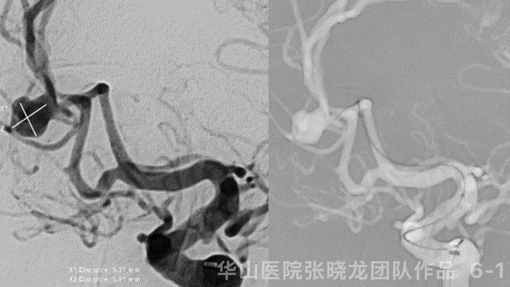 图 6 GIF. 测量动脉瘤大小7.9*7.8mm,瘤颈3.7mm。行全身肝素化。由于髂动脉和腹主动脉迂曲,选用90cm 0.089长鞘置于左侧颈内动脉起始部。115cm 6F通桥中间导管置于颈内动脉颅底处。经导管灌注尼莫地平1ml。直头SL-10微导管在微导丝导引下置于瘤腔。经微导管依次填入4枚弹簧圈(Tonbridge Feng helical 10mm*30cm, 7mm*30cm, 6mm*20cm & Target 360 3mm*4cm) 。